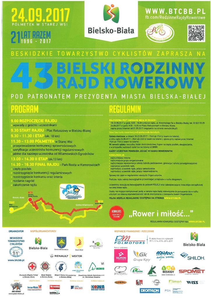 Beskidzkie Towarzystwo Cyklistów już po raz 43 organizuje Bielski Rodzinny Rajd Rowerowy pod patronatem Prezydenta Miasta Bielska - Białej. W tym roku trasa rajdu przebiega przez Gminę Wilamowice. Uczestnicy zawitają do urokliwej miejscowości jaką jest Stara Wieś, gdzie będzie miał miejsce półmetek rajdu. Informacje na niżej zamieszczonym plakacie.