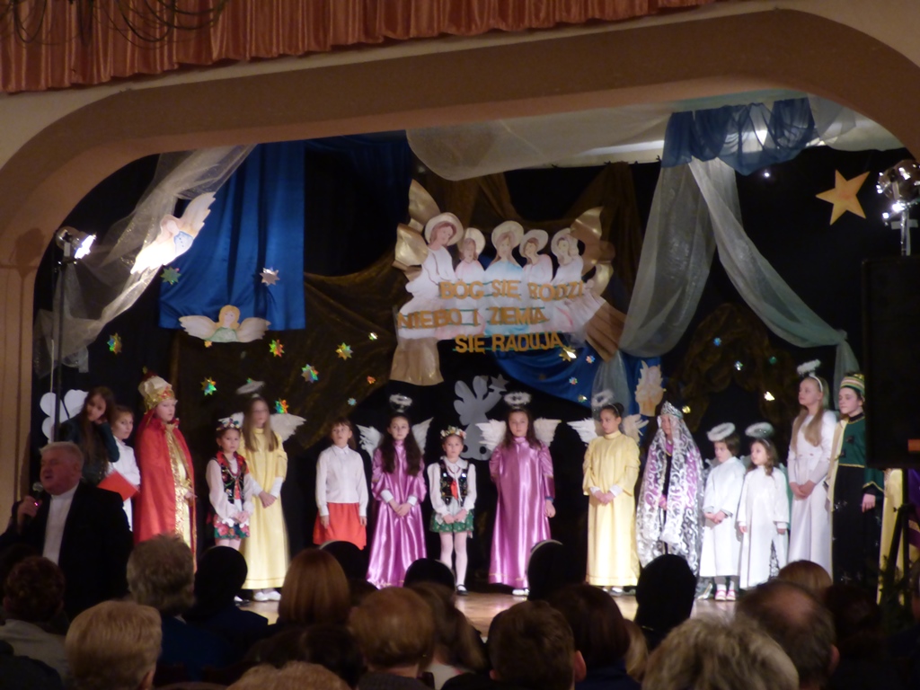 Wśród postaci, które zaprezentowały się na scenie byli: Święta Rodzina, Mędrcy ze Wschodu, znane z historii Polski osoby, które pragnęły złożyć hołd Jezusowi. Treści przedstawienia zilustrowane były tańcem, a całość podniosłych chwil dopełnił pięknym śpiewem kolęd chórek uczniów gimnazjum pod kierunkiem p. M.Gawlik.