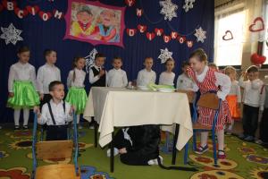 Starszaki przygotowały dla ukochanych gości scenki kabaretowe pt. „Dziadku, opowiedz nam bajkę”. Śpiewały piosenki z dziecięcego repertuaru, wykonywały niebanalne układy choreograficzne oraz recytowały wierszyki okolicznościowe. Po udanym występie zaproszeni goście w podziękowaniu za przybycie otrzymali od swoich wnucząt drobne upominki. Babcie i Dziadkowie nie pozostali dłużni nagradzając wnuki gromkimi brawami.