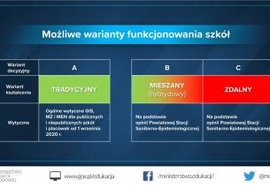 Informacje w linku: https://www.gov.pl/web/edukacja/bezpieczny-powrot-do-szkol-dzialania-men-w-organizacji-roku-szkolnego-20202021-w-warunkach-epidemii