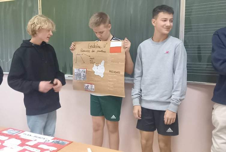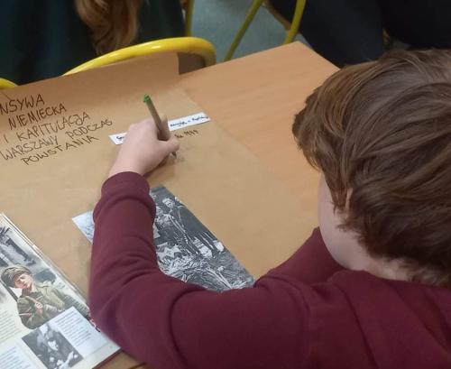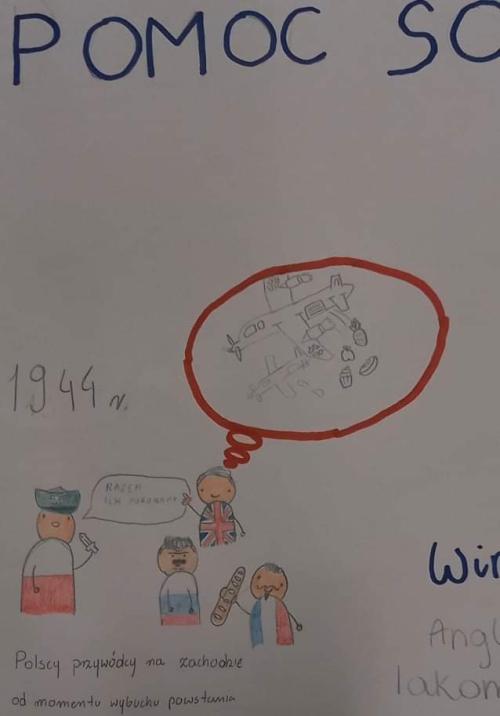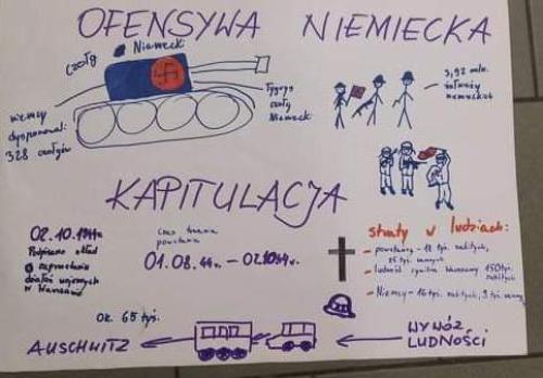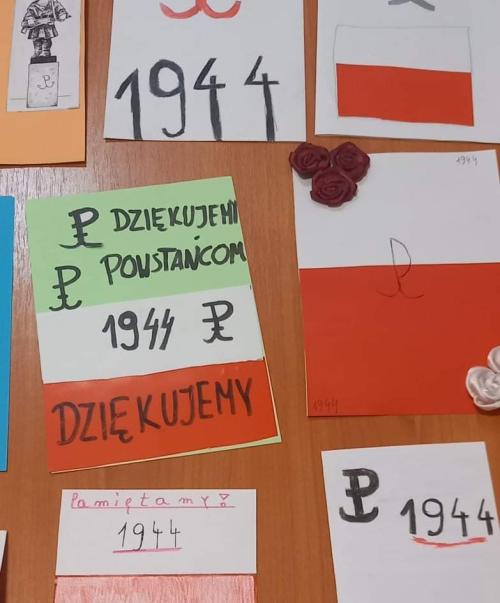 Zginąć razem z rannym przyjacielem czy zostawić go i ratować własne życie? Czy bitwa o Stolicę ma w ogóle sens – przecież umiera tak wiele osób? Przed takimi i innymi dramatycznymi wyborami stali Powstańcy Warszawscy. Przywołanie na lekcję takich prawdziwych bohaterów jest ważnym elementem edukacji by kształtować młode pokolenia. Pokazuje też uczniom, że historia nie musi być nudna. W naszej szkole w klasach ósmych przeprowadzone zostały lekcje dotyczące powstania. Uczniowie po obejrzeniu materiału filmowego wykonali w grupach plakaty dotyczące kluczowych zagadnień i zaprezentowali je swoim kolegom. Uczniowie klasy 7a pod kierownictwem p. Aliny Kajty - Bożek wykonali również kartki dla Powstańca, które zostaną przekazane żyjącym jeszcze uczestnikom powstania, by w ten sposób wyrazić pamięć o ich bohaterstwie.