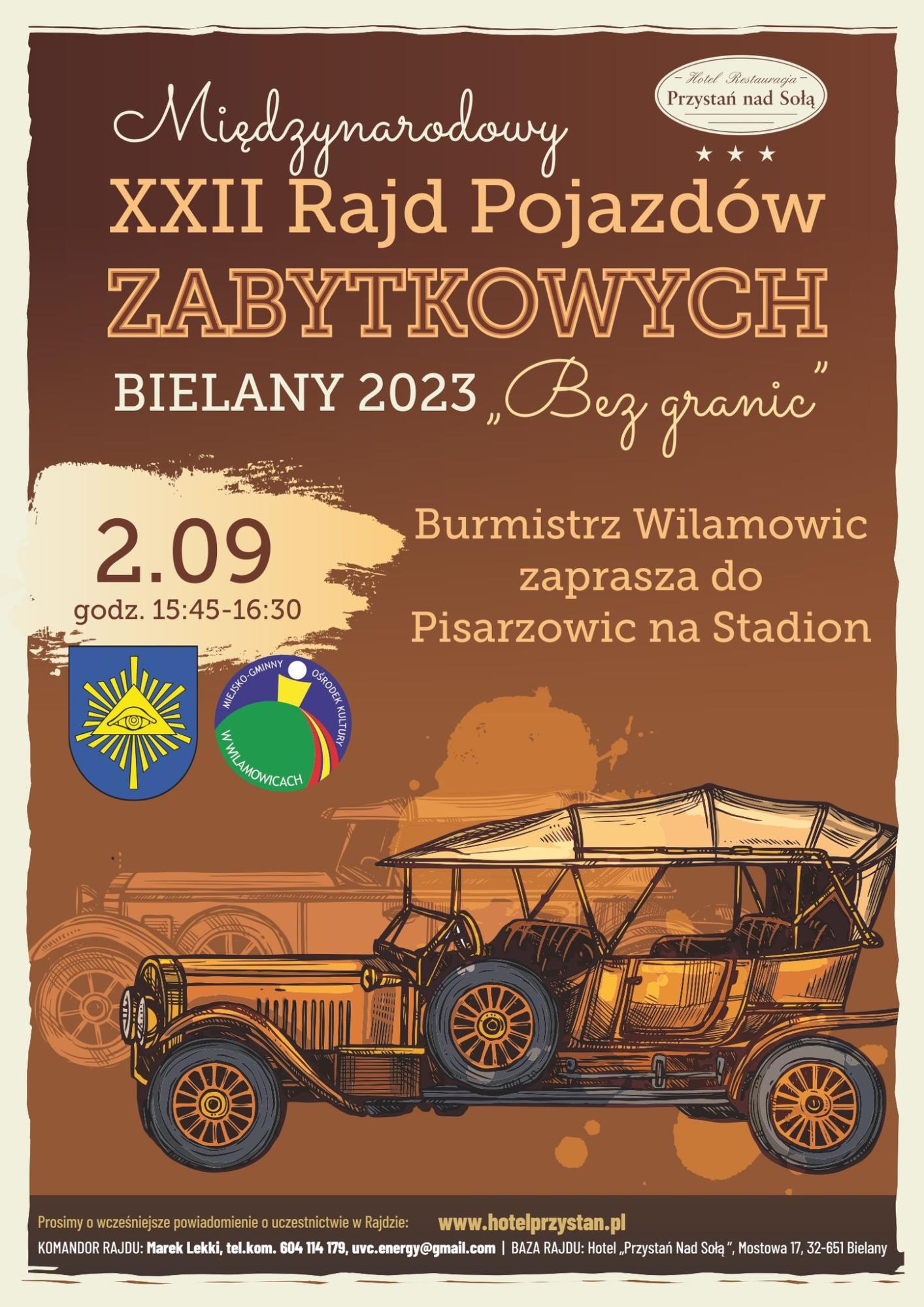 Burmistrz WILAMOWIC zaprasza do Pisarzowic na stadion gdzie 2 września 2023 odbędzie się Międzynarodowy XXII Rajd Pojazdów ZABYTKOWYCH - Bielany 2023 - "Bez Granic"