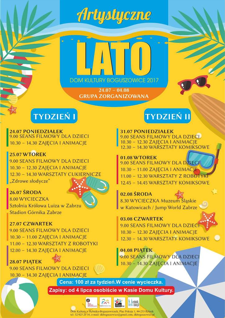 Dom Kultury w Rybniku-Boguszowicach zaprasza na akcję Artystyczne Lato, która będzie miała miejsce od 24.07.2017 do 04.08.2017 (z wyłączeniem weekendu).