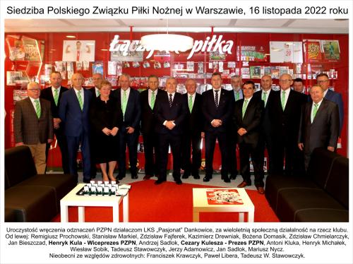 16 listopada 2022 r. w siedzibie Polskiego Związku Piłki Nożnej w Warszawie miało miejsce szczególne wydarzenie. 15 osobowa grupa działaczy Ludowego Klubu Sportowego PASJONAT Dankowice (powiat bielski) spotkała się z Prezesem Polskiego Związku Piłki Nożnej, Panem Cezarym Kuleszą, Wiceprezesem PZPN Panem Henrykiem Kulą oraz Zastępcą Sekretarza Generalnego PZPN Panem Markiem Łukiewskim.