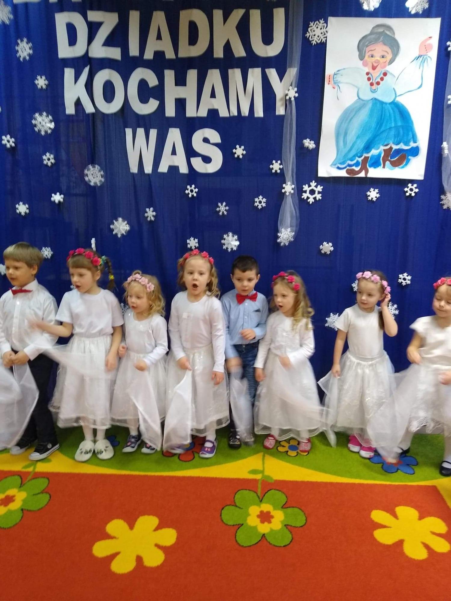 Dzieci zaprezentowały swoje talenty i umiejętności poprzez różnorodne formy: recytację wierszy, śpiewanie piosenek w języku polskim, angielskim oraz migowym, instrumentację utworów muzycznych, tańce (walc, polka, taniec z chustami) oraz odgrywanie humorystycznych scenek. Po występach w ramach podziękowań wnuczęta wręczyły swoim babciom i dziadkom własnoręcznie wykonane upominki. To była naprawdę wyjątkowa uroczystość pełna radości, wzruszeń, uśmiechu i dumy. Poprzez takie uroczystości najmłodsi wyrażają miłość do najbliższych, dziękują za trud włożony w ich wychowanie oraz uczą się okazywania szacunku osobom dorosłym. Szczęśliwi oraz dumni dziadkowie nagrodzili małych artystów gromkimi brawami oraz przyczynili się do pokrycia kosztów wyjazdu do Domu Kultury w Kętach na musical „Czerwony Kapturek” w wykonaniu TEATRU MOICH MARZEŃ z Chorzowa.