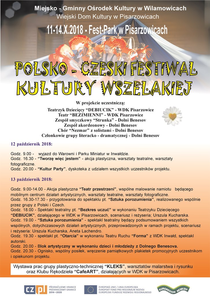 Zapraszamy mieszkańców  naszej gminy na spektakle teatralne realizowane przez Teatrzyk Dziecięcy "DEBIUCIK" oraz zaproszonych na "Polsko - Czeski Festiwal Kultury Wszelakiej" gości! To już w najbliższą sobotę, od godziny 18.00 w Fest-Parku w Pisarzowicach. Impreza odbędzie się w namiocie plenerowym, więc na wszelki wypadek zabierzcie ciepły sweter :-) .