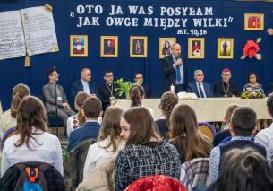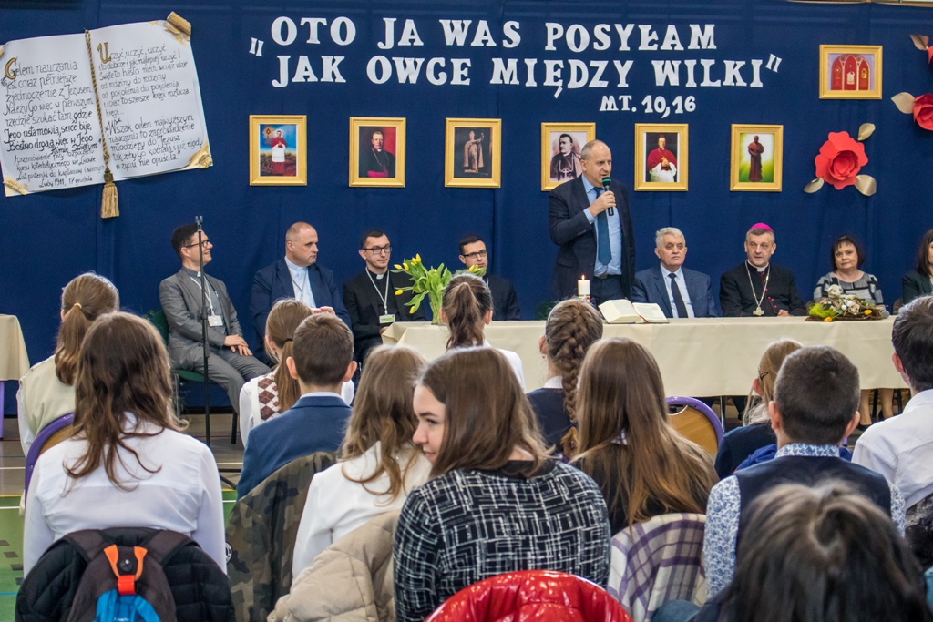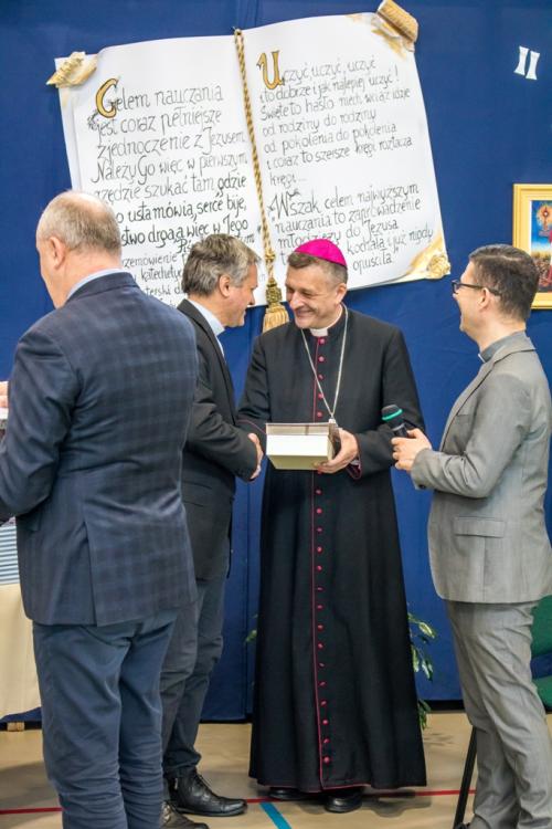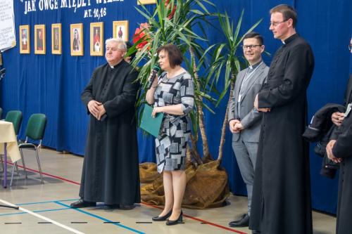 Następnie spotkaliśmy się w szkole na ogłoszeniu wyników i rozdaniu nagród. W tym wydarzeniu uczestniczyli ks. Bp Roman Pindel ordynariusz diecezji bielsko – żywieckiej, ks. Marek Studencki – dyrektor Wydziału Katechetycznego, p. Jacek Szczotka – zastępca kuratora delegatury śląskiej oraz nasz burmistrz p. Marian Trela. Pierwsze miejsce zajęła Teresa Gandor z Niepublicznej Szkoły Podstawowej z Zabrza Mikulczyce, z diecezji gliwickiej zdobywając 54 pkt. Drugie miejsce zajął Arkadiusz Jasiak z Salezjańskiego Zespołu Szkół z Zabrza Helenka, z diecezji gliwickiej uzyskując 52 pkt. Trzecie miejsce  przypadło Bogdanowi Kucharskiemu z SP22 z Jaworzna. Zwycięzcom gratulujemy wspaniałych wyników, jak również wszystkim uczestnikom konkursu.