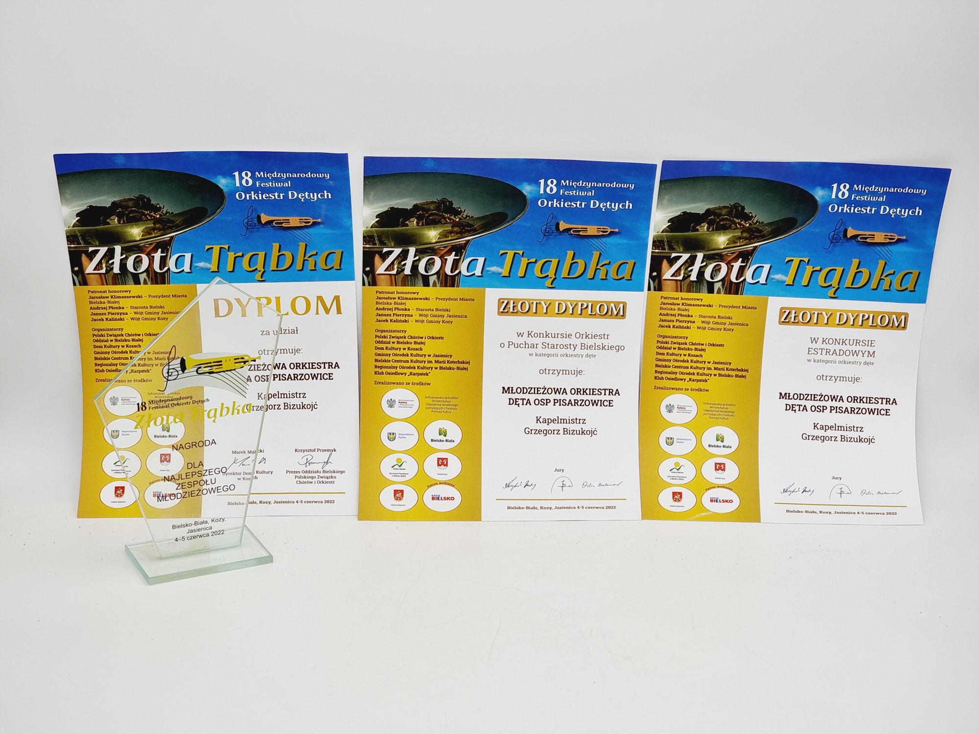 Miło nam poinformować, że Młodzieżowa Orkiestra Dęta OSP Pisarzowice z sukcesami wystąpiła na międzynarodowym festiwalu „Złota Trąbka”. Zdobyli oni złoty dyplom w sobotnim konkursie estradowym, złoty dyplom w konkursie o puchar starosty, który odbywał się w niedzielę oraz statuetkę najlepszego młodzieżowego zespołu całego festiwalu!