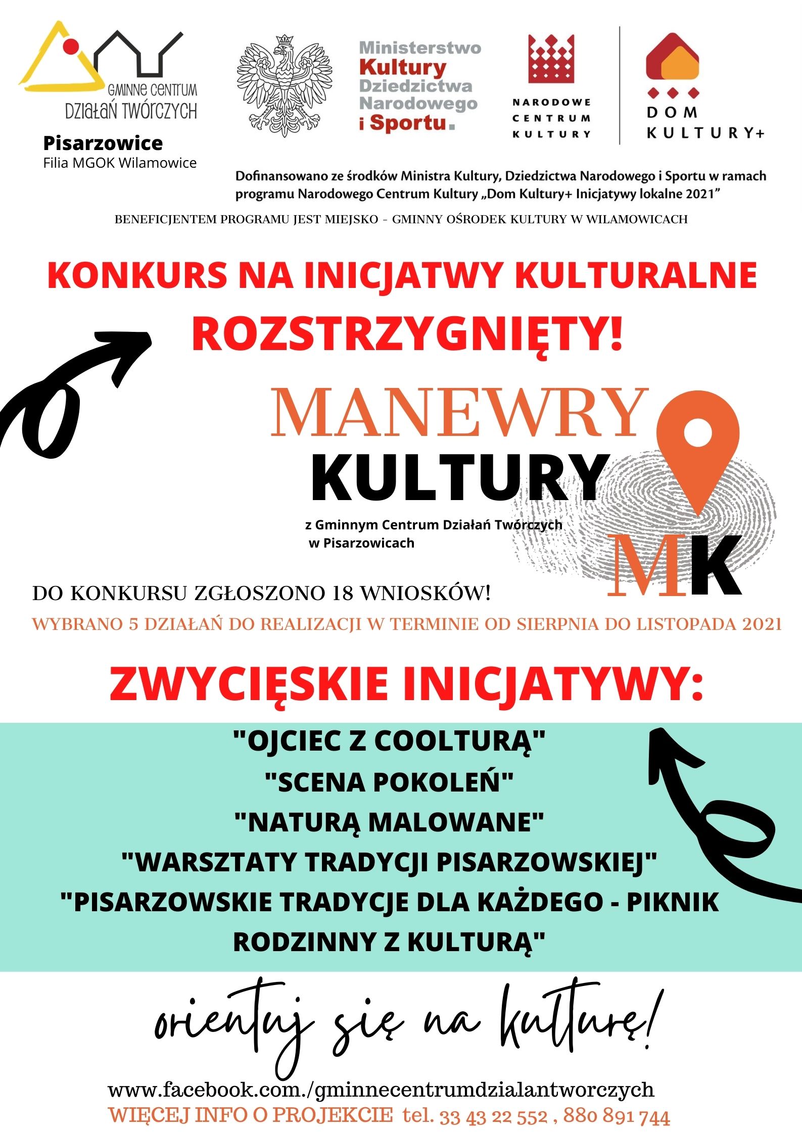 Spośród 18 zgłoszonych inicjatyw, jury wyłoniło zwycięskie projekty. Jury w którym znaleźli się pracownicy GCDT, animator NCK oraz diagnosta rekomendowało połączenie kilku inicjatyw w jedno działanie - tak powstał harmonogram uwzględniający 5 działań, których realizacja przypadnie na okres od sierpnia do końca listopada 2021. Zwycięskie inicjatywy to: „Scena pokoleń” - projekt zgłoszony przez Lilianę Białas, „Ojciec z coolturą” - projekt Bartłomieja Nikla, Tomasza Kucharskiego i Marcina Chrobaka, „Naturą malowane” - projekt zgłoszony przez Danutę Mleczko, „Warsztaty tradycji pisarzowskiej” - projekt Ewy Durlak i Barbary Mazur, „Pisarzowskie tradycje dla każdego - rodzinny piknik z kulturą” - projekt Cecylii Puzoń, Ilony Pudełko i Iwony Kamińskiej.