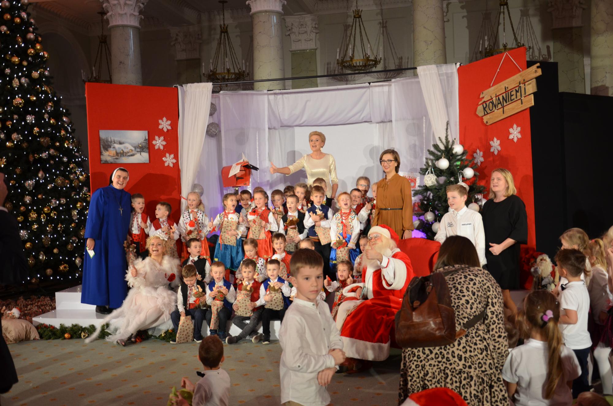 Ostatnim, ale zarazem najważniejszym etapem wędrówki przez stolicę był Pałac Prezydencki! Droga na Krakowskie Przedmieście nie obyła się bez perypetii, o mały włos przez RAJD BARBÓRKA  i Warszawskie korki mali Wilamowianie spóźnili by się na uroczystość, ale dzięki poślizgowi jaki powstał, dzieci wysiadając z autokaru mogły zobaczyć podjazd pod Pałac Prezydencki samego prezydenta Andrzeja Dudy! W Pałacu czekała już Pani Prezydentowa Agata Kornhauser - Duda razem z Mikołajem i Śnieżynką Biały Puszek. Przedstawienie wywołało wśród dzieci wiele emocji, każdy chciał się dostać wprost na kolana Świętego, lub choć na chwilkę porozmawiać ze Śnieżynką.  Po oficjalnej części uroczystości Pierwsza Dama zaprosiła wszystkich na obiad! Każdy miał możliwość bezpośredniego spotkania i rozmowy z Panią Prezydentową! Ochronkowe Przedszkolaki na to spotkanie wybrały się w strojach regionalnych, przez co zaprezentowały się wyjątkowo i wyróżniały na tle innych grup! Pani Agata od razu rozpoznała charakterystyczne stroje i przywołała wspomnienia z lutego tego roku, kiedy to odwiedziła Przedszkole Niepubliczne - Ochronkę im św. J. Bilczewskiego  w Wilamowicach! Skromny prezent podarowany przez dzieci sprawił tak wiele radości! Pani Prezydentowa tłumaczyła dzieciom,  jak ważne są dla niej prezenty robione ręcznie przez przedszkolaków! Zapewniła, że i ten podarunek zawiśnie na specjalnym korytarzu przy Jej gabinecie, gdzie ściany są już pełne od takich małych arcydzieł, ale i na to znajdzie się miejsce! Dzieci przekazały Pierwszej Damie prezent od Burmistrza Miasta i Gminy Wilamowice a na ręce Szefa Kancelarii Prezydenckiej został złożony list ze specjalnym zaproszeniem dla Pary Prezydenckiej do  Naszej Małej Ojczyzny jaką są Wilamowice.