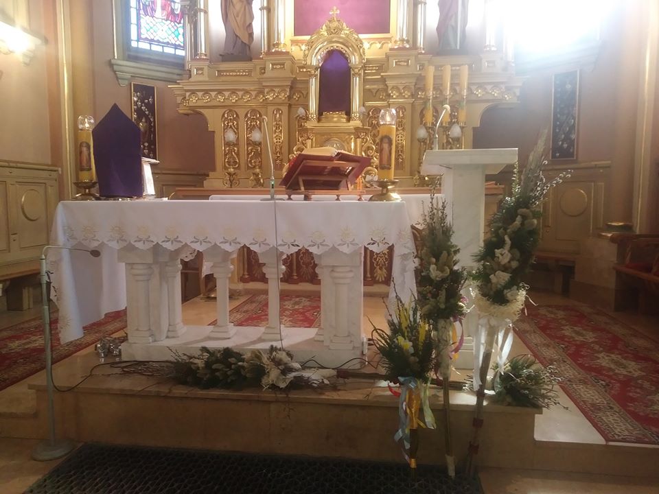 W Niedzielę Palmową wielu hecznarowian zgromadziło się w swoich domach przed ekranami monitorów. Zobaczyli ołtarz w swoim kościółku przystrojony wielkanocnymi palmami i usłyszeli słowa swojego proboszcza: „Spodobało się Panu Bogu zafundować nam Święta Paschalne w nowym wydaniu, w których Pan odziera nas z wszelkich splendorów i zewnętrzności, żeby nic nam go nie przesłaniało. Z niego, w Święta Paschalne zdarli nawet tunikę, pozbawili wszystkiego, co miał ze świata. Dlatego Pan zaprasza nas tym razem, aby wejść do swej izdebki i oddawać mu cześć w Duchu i Prawdzie. Jest podobnie jak w pierwszej liturgii, gdzie możemy przeczytać, że pod krzyżem stało tylko pięć osób: Matka Jezusa, siostra Matki Jego, Maria żona Kleofasa, Maria Magdalena i uczeń Jan, którego Pan miłował. Na początku mszy nastąpiło błogosławieństwo palm, tych przed ołtarzem i w sposób szczególny tych w domach.