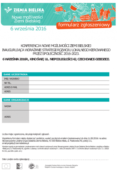 GD Ziemia Bielska zaprasza mieszkańców, przedsiębiorców, przedstawicieli gmin i organizacji pozarządowych na konferencję „Nowe możliwości Ziemi Bielskiej”, 06.09.2016 r., Kino Świt w Czechowicach-Dziedzicach, wstęp wolny.