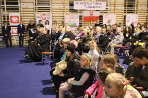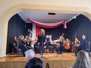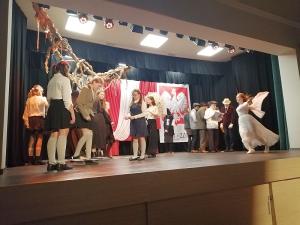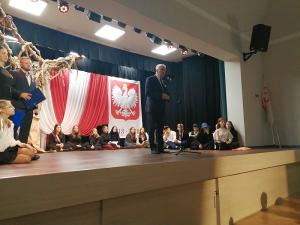 Po mszy wszyscy przeszli do szkoły, gdzie nauczyciele wraz z uczniami przygotowali wieczornicę. Rozpoczął ją choreograficzny układ baletowy symbolizujący odrodzenie Polski po latach niewoli. Później prowadzący wraz z dziejopisarzem przeprowadzili widzów przez wieki walk o niepodległość naszej Ojczyzny, a szkolny chór i soliści (którzy zachwycili niezwykłym talentem wokalnym), a także recytatorzy, zobrazowali prezentowaną historię piosenkami i strofami wierszy. Widzowie z pewnością zapamiętają też Tadeusza Kościuszkę składającego narodowi przysięgę wzniesioną w górę szablą, że albo oswobodzi kraj, albo sam zginie. Towarzyszyły mu dwie krakowianki, które komentowały niezwykły nastrój panujący wówczas na krakowskim Rynku. Wymownym obrazem była także scenka rozbiorowa, gdzie przedstawiciele trzech państw zaborczych rozszarpywali mapę ówczesnej Polski.