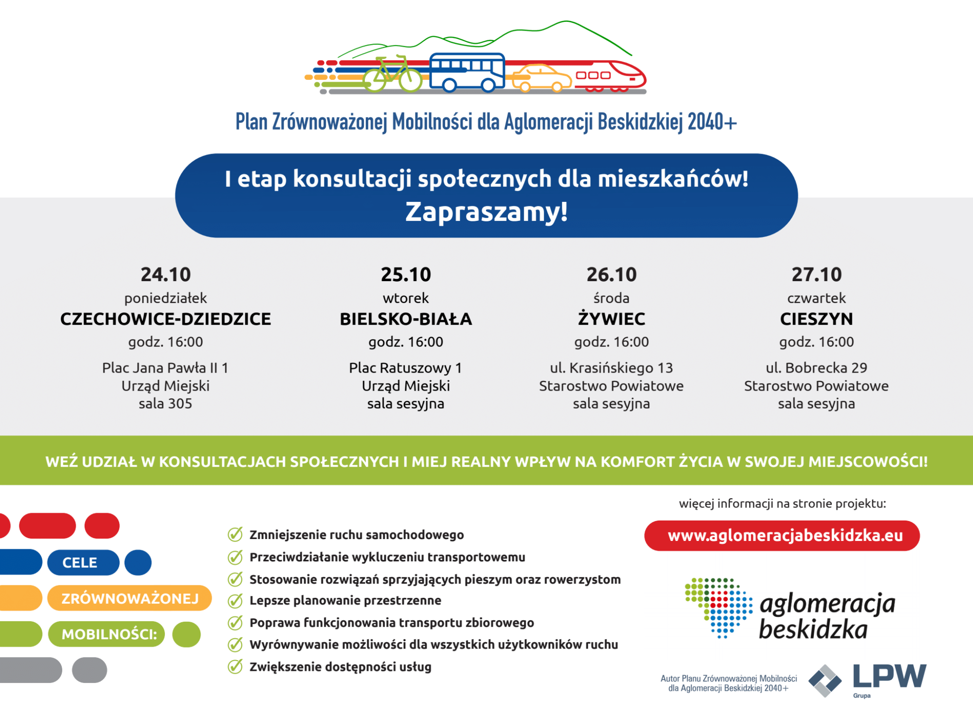 Już od 24 do 27 października zapraszamy mieszkańców do wzięcia udziału w pierwszym etapie konsultacji społecznych Planu Zrównoważonej Mobilności Aglomeracji Beskidzkiej.