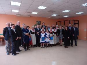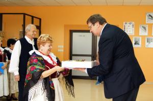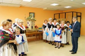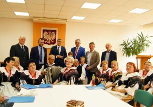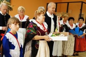 Jednakże nim wszyscy uczestnicy korowodu dożynkowego dotarli do Starostwa Powiatu Bielskiego, zostali zaproszeni na salę obrad na zakończenie posiedzenia Sejmowej Komisji Mniejszości Narodowych i Etnicznych w województwie śląskim. Posłowie zasiadający w sejmowej Komisji wcześniej debatowali w Wilamowicach, a dzisiaj w Bielsku-Białej. Serdecznie i gorąco na salę obrad członków zespołu zaprosili wojewoda śląski Jarosław Wieczorek, wicewojewodowie Jan Chrząszcz i Mariusz Trepka, pełnomocnik wojewody śląskiego ds. mniejszości narodowych i etnicznych Magdalena Szewczuk-Szturc oraz posłowie. Członkowie Zespołu wnieśli tegoroczny wieniec dożynkowy w kształcie ula, kierownik muzyczny Zespołu pan Stanisław Olearczyk złożył na ręce Gospodarza „Nalewkę Wiejskiej Gospodyni”, a przewodnicząca KGW Pisarzowice Cecylia Puzoń, kołacz dożynkowy, życząc wszystkim zebranym, by na stołach wszystkich mieszkańców województwa śląskiego, na stołach mieszkańców naszej Ziemi Beskidzkiej nie zabrakło strawy dla ducha i ciała. We wspaniałej atmosferze, śpiewie nie tylko dożynkowych piosenek upłynął szybko czas.