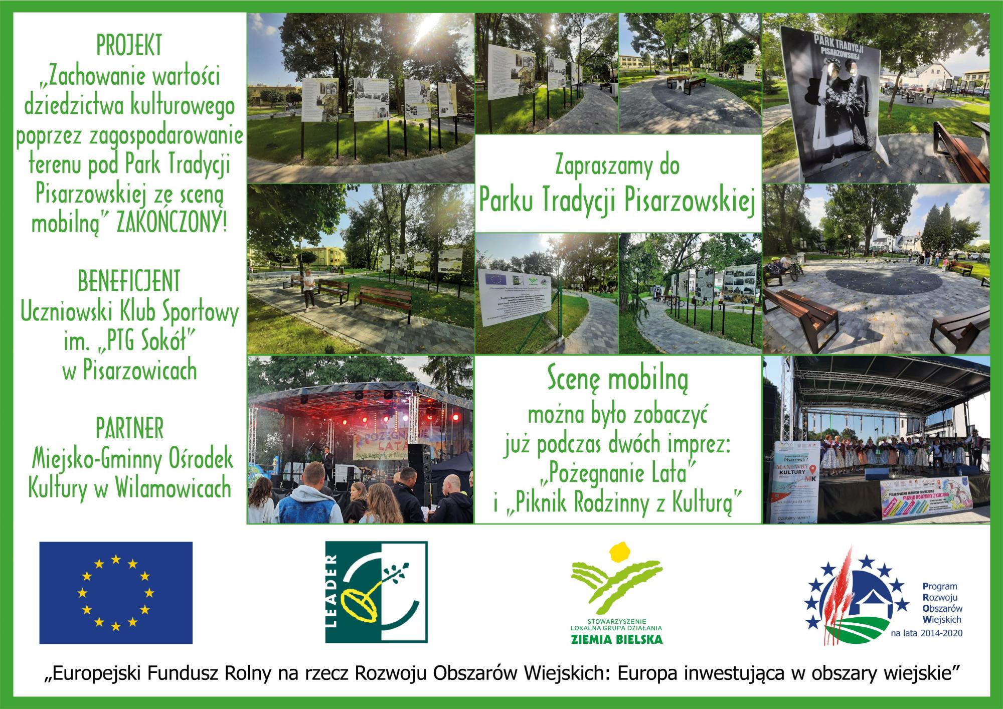 Uczniowski Klub Sportowy im. „PTG Sokół” w Pisarzowicach zrealizował projekt pod nazwą „Zachowanie wartości dziedzictwa kulturowego poprzez zagospodarowanie terenu pod Park Tradycji Pisarzowskiej ze sceną mobilną” dofinansowany ze Stowarzyszenia Lokalna Grupa Działania „Ziemia Bielska”.