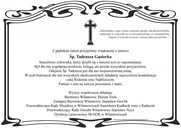 Pogrzeb śp. Tadeusza Gąsiorka odbędzie się w środę 9 grudnia 2020 o godz. 14.00 w kościele parafialnym w Wilamowicach.