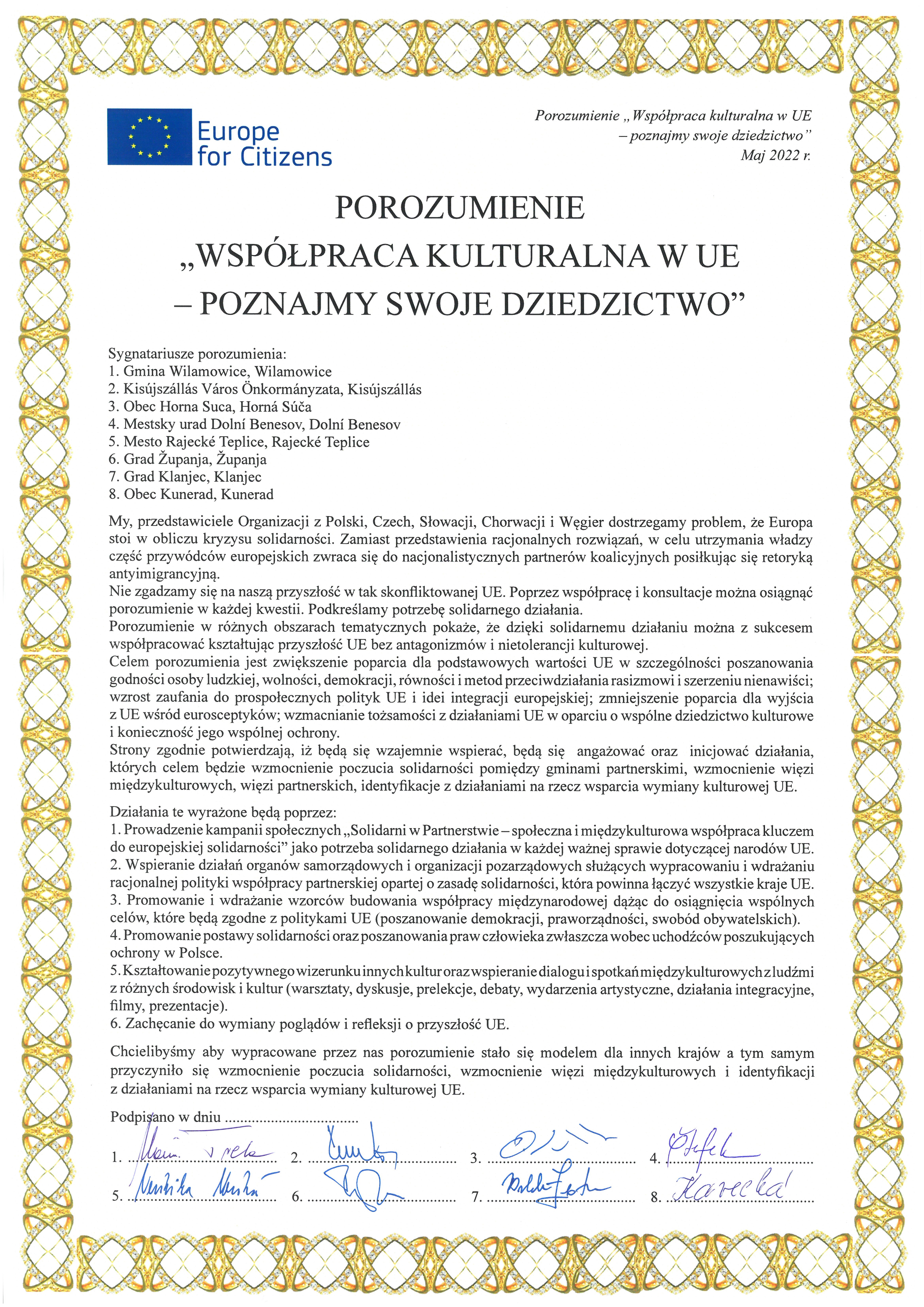 Dzięki obecności przedstawicieli różnych środowisk artystycznych, podczas warsztatów interkulturalnych, wspólnie opracowaliśmy porozumienie pn.: „Współpraca kulturalna w UE - poznajmy swoje dziedzictwo”, które następnie zostało podpisane przez wszystkich przedstawicieli miast partnerskich biorących udział w projekcie. W ramach działań integracyjnych, uczestnicy tego wydarzenia wzięli udział w dwudniowej, wiodącej imprezie na terenie gminy pod nazwą „Wilamowskie Śmiergusty”, która cieszy się dużą popularnością na Podbeskidziu. Z nowymi planami dotyczącymi przyszłej współpracy partnerskiej w dziedzinie kultury, uczestnicy zakończyli spotkania z Programu Europa dla Obywateli.