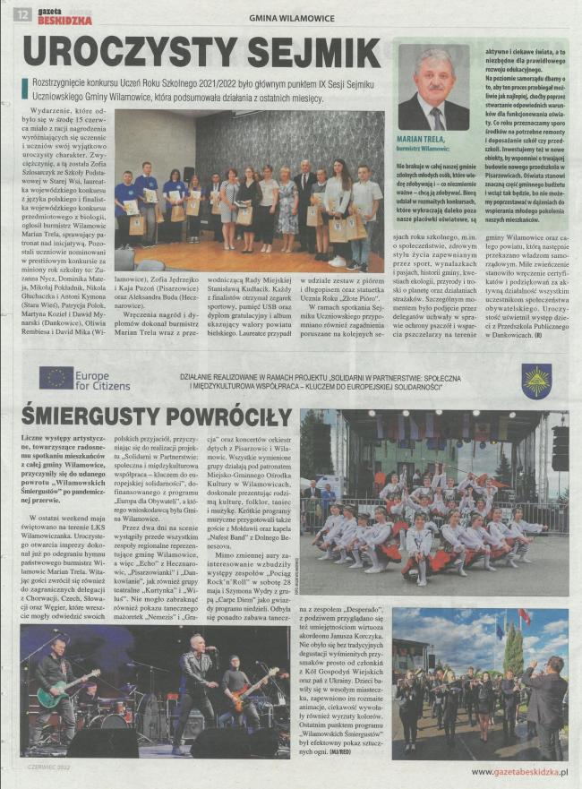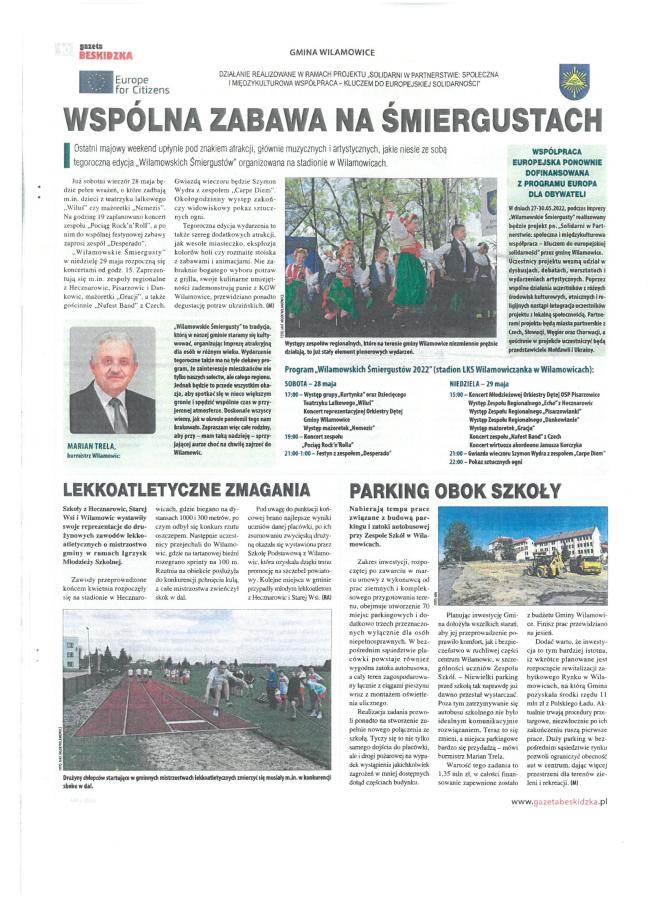 Dopiero po dwóch latach przerwy pandemicznej Gmina Wilamowice mogła zrealizować międzynarodowy projekt pn. „Solidarni w Partnerstwie: społeczna i międzykulturowa współpraca - kluczem do europejskiej solidarności” sfinansowany przez Unię Europejską w ramach Programu Europa dla Obywateli, w ramach działania 2.1 Partnerstwo miast. Początkowo projekt miał odbyć się w czerwcu 2020 r., jednak z uwagi na Covid-19, nie było to możliwe i dzięki pozytywnej zgodzie Komisji Europejskiej, termin działań został przełożony.