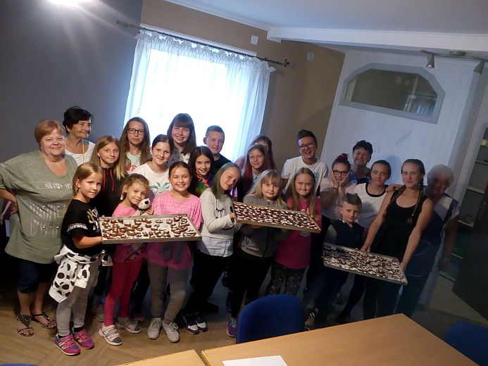 W godzinach popołudniowych wypoczywająca na półkolonii 20-osobowa grupa teatralna spędziła przyjemnie i pożytecznie czas. Pod czujnym okiem prowadzących warsztaty pań oraz kierownik Wiejskiego Domu Kultury p. Urszuli Kucharskiej prowadzącej Teatrzyk Dziecięcy i organizatorki tejże półkolonii, dzieci uczyły się jak upiec „Marcinki pisarzowickie”, czyli pierniki ozdobione lukrem.
