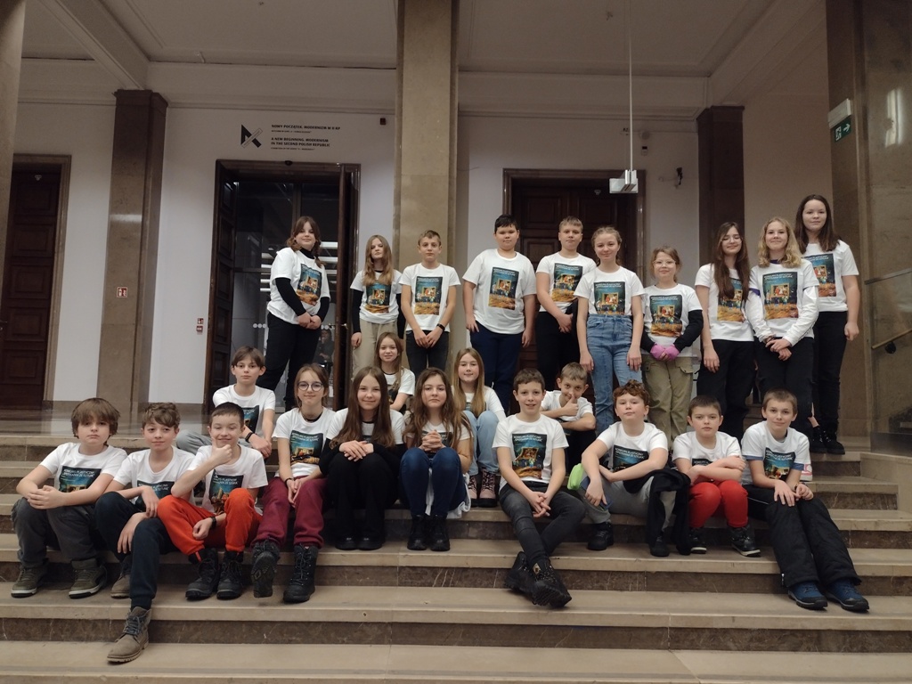 Dnia 2 lutego 2023 r. udaliśmy się do najstarszego i największego polskiego Muzeum Narodowego w Krakowie na lekcję muzealną. Warsztaty były nagrodą otrzymaną w Ogólnopolskim Konkursie Plastycznym „Spotkania ze sztuką”, której organizatorem była Fundacja PGE w Warszawie. Praca malarska Amelii Gołuch została wyróżniona w wyżej wymienionym konkursie. Dzięki uprzejmości Fundacji wszyscy uczniowie nagrodzonej klasy otrzymali pamiątkowe koszulki z nadrukiem tytułu konkursu i obrazem Jana Matejki pt. „Portret trojga dzieci artysty”. Taka pamiątka będzie przypominała nam o wyjątkowych chwilach spędzonych w Krakowie.