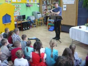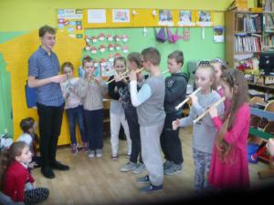 Poprowadził on warsztaty muzyczne prezentując swój instrument - flet poprzeczny. Uczniowie zostali zapoznani z budową i historią tego instrumentu oraz wysłuchali solowego koncertu.