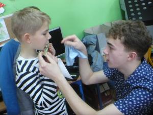Drugą część warsztatów wypełniły zajęcia z fletami prostymi, z którymi uczniowie zostali zaproszeni na spotkanie. Dzieci szukały odpowiedzi na pytanie - co trzeba wiedzieć, żeby grać na takim instrumencie i poznały technikę gry. Absolwent naszej szkoły P. Artur zademonstrował pozycję grającego, sposób trzymania instrumentu oraz przeprowadził szereg ćwiczeń, dzięki którym dzieci poznały możliwości prawidłowego gospodarowania oddechem i ułożenia palców na instrumencie. Uczniowie próbowali nawet swoich sił w wygrywaniu dźwięków.