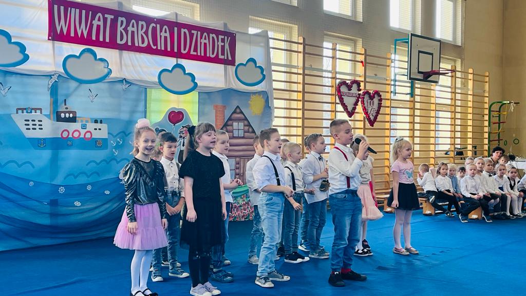Mali aktorzy zaprosili ukochane babcie i wspaniałych dziadków na wspomnieniowo-muzyczny rejs statkiem przez lata dzieciństwa, szkoły, młodości aż po wiek dojrzały. W programie nie zabrakło akcentów humorystycznych. Piękna dekoracja odzwierciedlała treść przedstawienia. Na wstępie przedszkolaki z grupy V i VI wzruszającymi słowami wierszy określali ciepłe relacje jakie łączą ich z babcią i dziadkiem. Następnie „marynarze” z kl. I „a” piosenką „Parostatek” porwali gości w rejs statkiem przez kolejne etapy życia. I tak o dzieciństwie opowiedziała piosenka pt. „Kiedy babcia była mała” w wykonaniu przedszkolaków z grupy V . W czasie lat szkolnych dziadków królował przebój zespołu Czerwone gitary „Kto za Tobą w szkole ganiał” i tę właśnie piosenkę zaproszeni goście wspólnie zaśpiewali. Lata młodości przypomnieli uczniowie kl.I „b” piękną aranżacją piosenki „Ktoś mnie pokochał” i wykonaniem skocznego rock and rolla. Następnie przedszkolaki z grupy VI zatańczyli do piosenki „Wesoła rodzinka”, a już wiek dojrzały to nic innego tylko „Czterdziestolatek” w wykonaniu uczniów kl. I „a”.