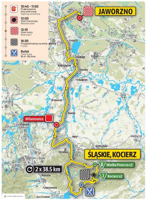 Czwartego dnia Tour de Pologne wjedzie w góry. Po starcie w Jaworznie kolarze pojadą na południe. Na pierwszej, bardziej płaskiej części dystansu znajduje się Lotna Premia LOTTO w Wilamowicach. Potem peleton wjedzie w malownicze Beskidy, gdzie peleton pokona dwie rundy po 38,5 kilometra. Tam na trasie znajdują się dwie Górskie Premie TAURON pierwszej kategorii – Kocierz oraz dwie drugiej kategorii – Wielka Puszcza. Etap czwarty odbędzie się pod hasłem 100-lecia Powstań Śląskich. Partnerem mety, która zlokalizowana jest przy Kocierz Hotel&Spa, jest Województwo Śląskie.