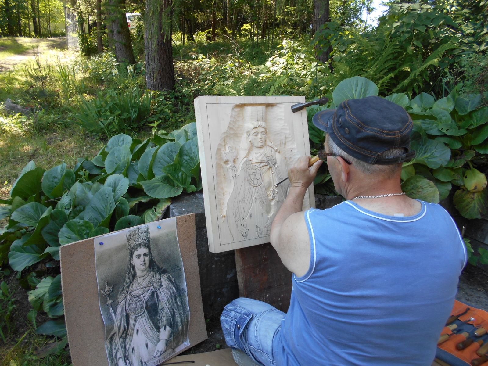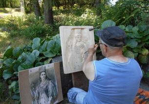 Artyści zabrali się do pracy, w której  tematem przewodnim była otaczająca przyroda. Pani Halina Formas uwieczniła jezioro, drzewa, łąki, na obrazie pani Basi Mynarskiej pojawiły się kolorowe motyle, a Natalia Liber namalowała ptaki. Dodatkowym tematem prac były postacie z historii Polski i Węgier – król Ludwik Węgierski, namalowany przez pana Jarosława Kacorzyka oraz królowa Jadwiga – obraz wykonany przez panią Halinę Mleczko. Nie tylko malarze intensywnie pracowali w plenerze. Pan Andrzej Maciejczyk przywiózł wcześniej przygotowany kawałek płaskiej deski z obrysem królowej Jadwigi i zaczął wycinać płaskorzeźbę. Po kilkugodzinnej owocnej pracy współmałżonkowie wraz z panem Władysławem Carbolem, opiekunem grupy, zorganizowali poczęstunek – grillowane kiełbaski i pyszne ciasta. Podczas  wspólnego spotkania artyści zaplanowali już następny plener, który zorganizują w Starej Wsi, a tematem przewodnim będzie architektura sakralna i świecka.