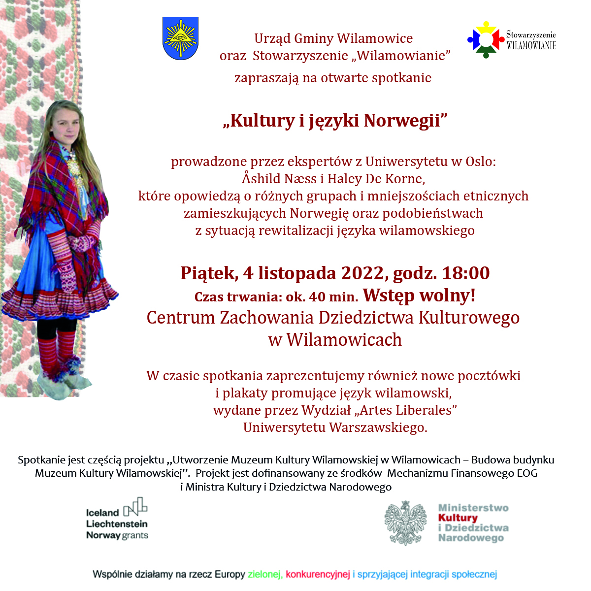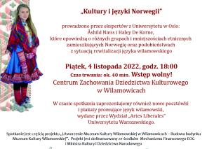 Urząd Gminy Wilamowice oraz Stowarzyszenie "Wilamowianie" zapraszają na otwarte spotkanie: "Kultury i języki Norwegii" prowadzone przez ekspertów z Uniwersytetu w Oslo: Åshild Næss i Haley De Korne, które opowiedzą o różnych grupach i mniejszościach etnicznych zamieszkujących Norwegię oraz podobieństwach z sytuacją rewitalizacyjną języka wilamowskiego.