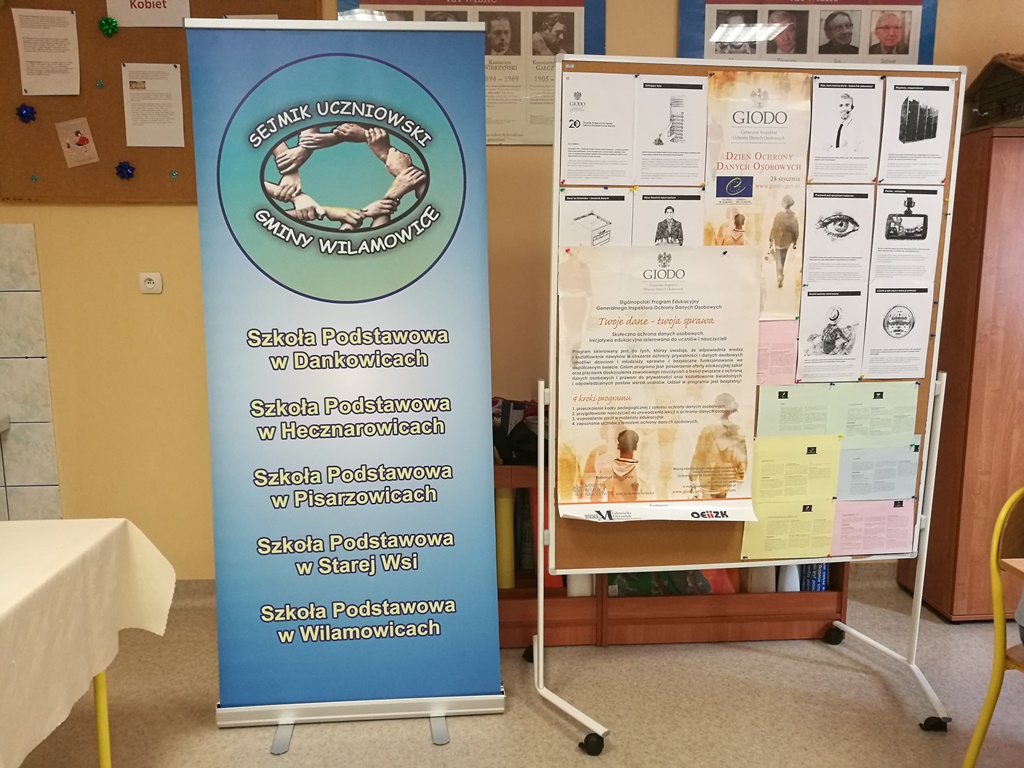 28 lutego 2018 r. odbyła się VI sesja Gminnego Sejmiku Uczniowskiego, której tematem była Ochrona Danych Osobowych. Delegatów i ich opiekunów gościło Gimnazjum w Wilamowicach. Wśród zaproszonych gości była również p. Bożena Sobocińska - kierownik ZOSiP oraz p. Mariola Dylewska-Mitoraj - dyrektor Zespołu Szkół w Wilamowicach. Gościem specjalnym była p. Anna Kunicka, nauczyciel historii i wiedzy o społeczeństwie z Zespołu Szkół w Wilamowicach, koordynator VIII edycji ogólnopolskiego programu GIODO „Twoje dane - twoja sprawa”, w którym nasza szkoła uczestniczy.