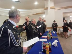 Orkiestra pod batutą Stanisława Trembli zagrała hymn strażacki. Następnie wprowadzono poczet sztandarowy, by radna Sejmiku Województwa Śląskiego pani Danuta Kożusznik i zarazem prezes Rejonowego Związku Rolników, Kółek i Organizacji Rolniczych w Bielsku-Białej wraz z komendantem Miejskiej Państwowej Straży Pożarnej w Bielsku-Białej bryg. Zbigniewem Mizerą mogli dokonać ceremonii wręczenia odznaczeń. Złotą Honorową Odznakę „Za zasługi dla województwa śląskiego” otrzymała Ochotnicza Straż Pożarna, która w 2017 r. roku obchodziła swoje 120-lecie działalności. O to odznaczenie wnioskowała Rada Sołecka Pisarzowic, a poparł RZRKiOR w Bielsku-Białej, na czele z panią prezes Danutą Kożusznik. Drugą Honorową Złotą Odznakę „Za zasługi dla województwa śląskiego” otrzymał sołtys Pisarzowic, druh Stanisław Peszel, który już od 40 lat udziela się społecznie dla Pisarzowic. O odznaczenie wnioskował Zarząd KGW Pisarzowice , a poparł wniosek RZRKiOR w Bielsku-Białej i pani Danuta Kożusznik. Po tej podniosłej uroczystości rozpoczęło się zebranie sprawozdawcze, które bardzo sprawnie prowadził sołtys, druh Stanisław Peszel. Przebiegało ono zgodnie z zatwierdzonym przez obecnych Porządkiem Zebrania.