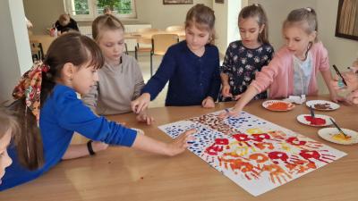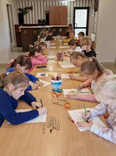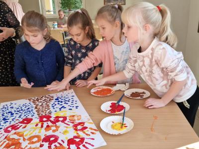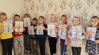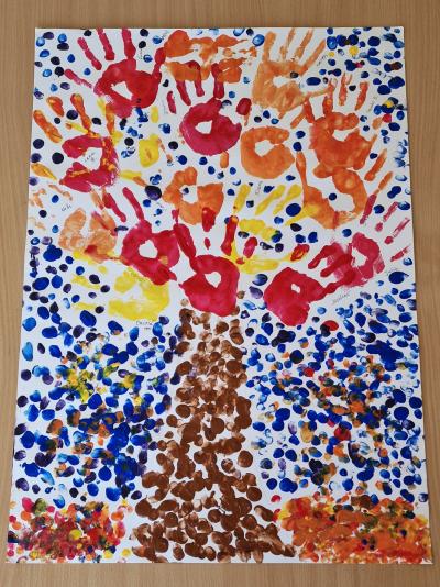 Podczas zajęć zainspirowani jesiennymi kolorami przypomnieli sobie podział na barwy ciepłe i zimne, poznali czym jest mozaika i wykonali kredkami wariację na ten temat. Stworzyli również pracę malarską odbijając swoje dłonie i paluszki na dużym formacie.