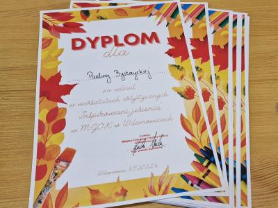 Na zakończenie dzieci na pamiątkę warsztatów otrzymały dyplomy z rąk dyrektor M-GOK Urszuli Kucharskiej oraz prowadzącej zajęcia Anny Klimczak. Prace, które wykonali mali artyści będą w najbliższych dniach zdobiły gazetkę w Zespole Szkół w Wilamowicach.
