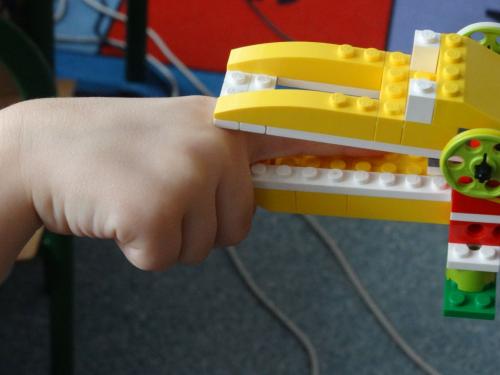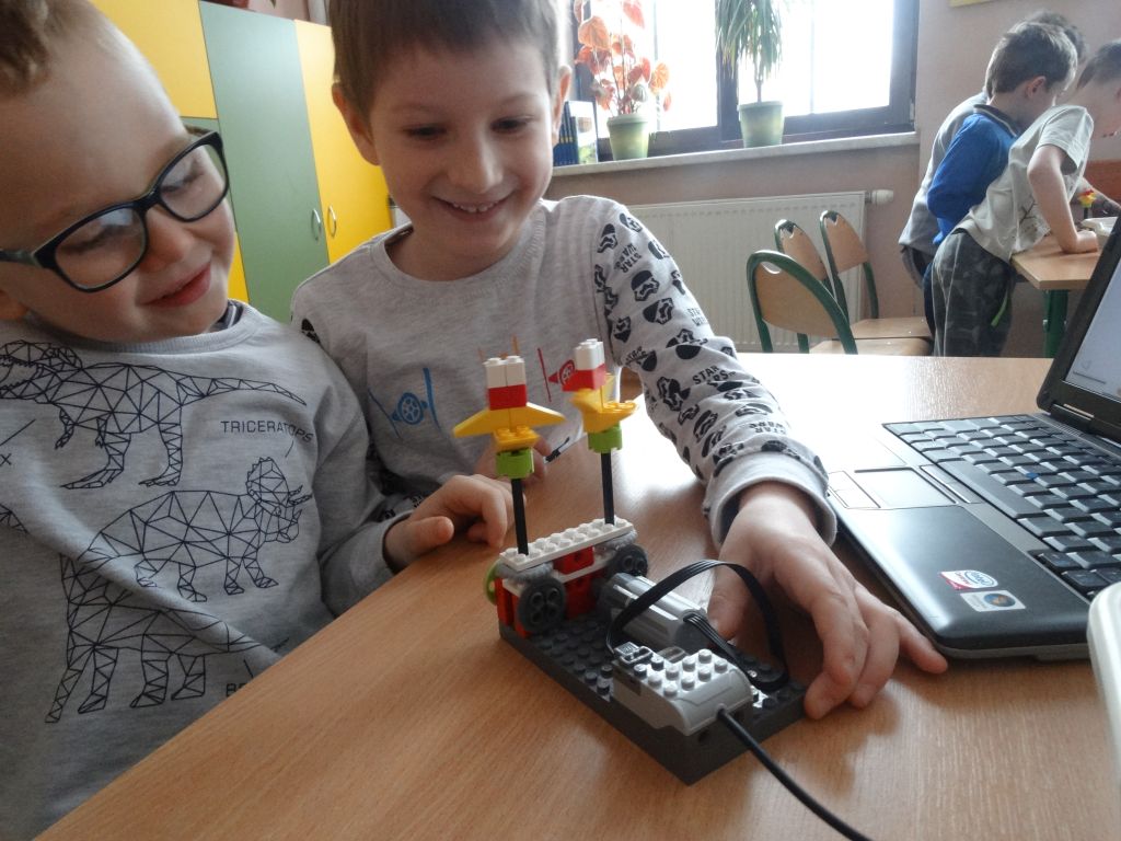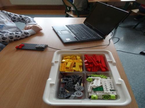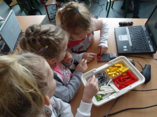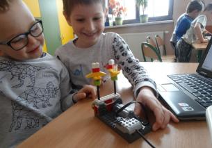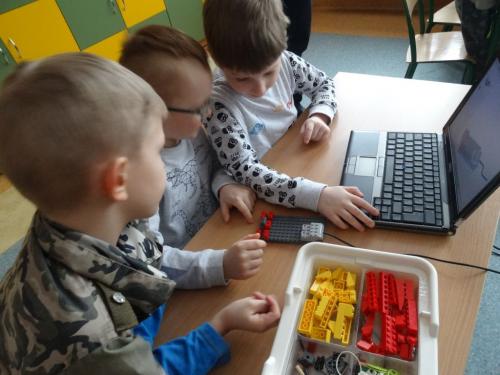 Zadaniem dzieci było złożenie klocków wg instrukcji na monitorze. Następnie przy podłączeniu przewodów do komputera  i naciśnięciu odpowiednich klawiszy i wprowadzały w ruch zbudowane wcześniej budowle. Większość dzieci bardzo szybko poradziła sobie z kolejnymi etapami zadań. Widać było, że ten rodzaj zabawy sprawia im ogromną radość, a klocki Lego i komputer nie stanowi żadnej trudności.