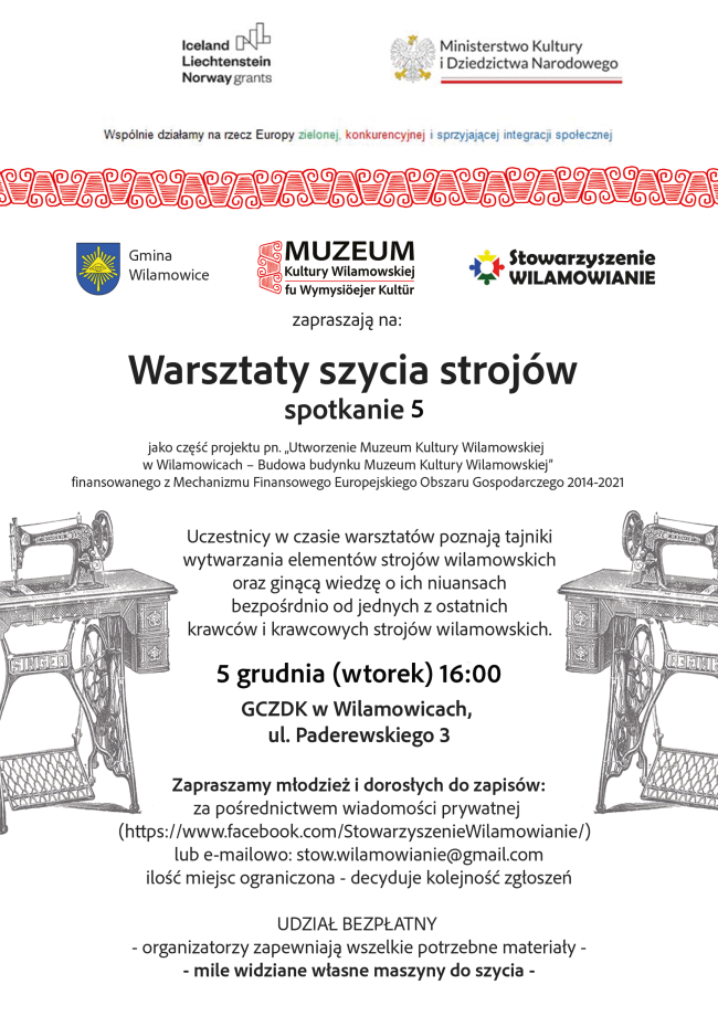 Uczestnicy w czasie warsztatów poznają techniki wytwarzania elementów strojów wilamowskich oraz ginącą wiedzę o ich niuansach bezpośrednio od jednych z ostatnich krawców i krawcowych.