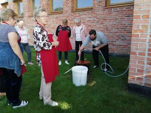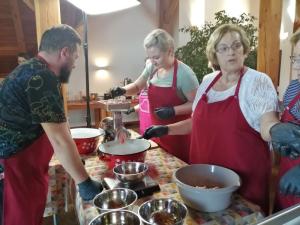 Cała grupa uczestniczyła w dwudniowych warsztatach sztuki robienia kiełbas. Wykładowca-instruktor wędliniarstwa Adam Pulkowski pokazywał, uczył jak robi się m.in. kiełbasę śląską - domowa parzona w jelicie cienkim wieprzowym, kiełbasę jałowcową - w jelicie cienkim wołowym „wiankowym”, wędzoną, pieczoną i podsuszaną, kiełbasę słoikową- farsz zamknięty w słoiku, tyndalizowana i kiełbasę szynkową drobiową - delikatna kiełbasa szynkowa w osłonce sztucznej poliamidowej, parzona. Zgłębialiśmy wiedzę na temat klasyfikacji surowców, peklowania, rozdrabniania, nadziewania, wędzenia, obróbki termicznej (parzenie, podpiekanie, studzenie) oraz podsuszania kiełbas.