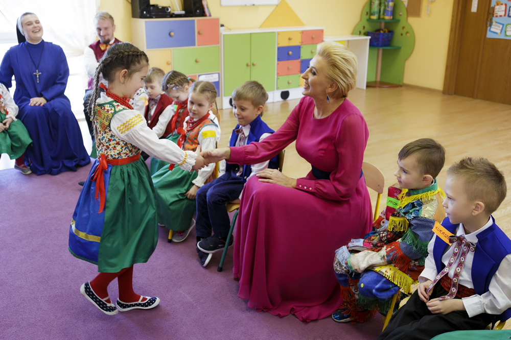 Trzeba przyznać, że Pierwsza Dama, jest bardzo otwarta i szybko zdobyła zaufanie dzieci. Przyznała, że to czego Jej w tym momencie najbardziej brakuje, to bezpośredni kontakt z dziećmi i młodzieżą! Nie bała się wyzwań i w pełni zaangażowała się w proponowane aktywności! Śmiało siadała z dziećmi na dywanie, przytulała je i zachęcała do odpowiedzi. Przedszkolaki z całą pewnością nie czuły przy niej żadnego dystansu, z chęcią podchodziły do Niej i opowiadały o sobie!