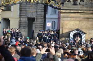 Następnie spacerując uliczkami kierowaliśmy się w kierunku Zamku Praskiego. Nie umknął naszej uwadze kościół Narodzenia Pańskiego. To tutaj na pierwszym piętrze pod arkadami znajduje się drugi po katedrze św. Wita, Wacława i Wojciecha na Zamku Praskim najcenniejszy skarbiec w Czechach. Najcenniejszym artefaktem w skarbcu jest Diamentowa Monstrancja, nazywana Praskim Słońcem z końca XVII wieku. Ozdobiona jest ponad 6-cioma tysiącami diamentów. Nim dotarliśmy na Plac Hradczański, nasza wspaniała przewodnik pani Barbara, skierowała nasze kroki na Nowy Świat do malowniczego zakątka pod barokowymi basztami, w którym zatrzymał się czas i gdzie do dzisiaj nie dociera ruch metropolii, pomimo nowoczesnych zmian w ostatnich czasach nadal zachowuje swój charakter , gdzie włada duch opiekujący się tym miejscem. Docieramy na Hradczany, coraz większy tłok i trzy ogromne kolejki z trzech stron stojących turystów, by dostać się na Zamek Praski. W dolnej części Placu zobaczyliśmy Pałac Arcybiskupi, gdzie w ogrodach mogliśmy w przytulnej kawiarence wypić pyszną kawę. Zobaczyliśmy Kościół św. Benedykta i Pałac Toskański oraz Pałac Schwarzenberski i będącą obecnie w remoncie Kolumnę morową. Udało się nam także zobaczyć zmianę warty honorowej przed Zamkiem Praskim.