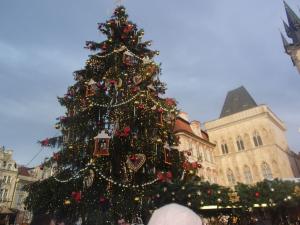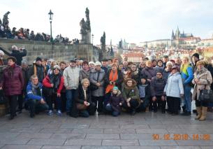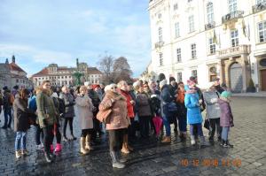 Z Placu Hradczańskiego podziwialiśmy piękną panoramę Małej Strany - Mniejsze Miasto, gdzie cała nasza grupa kierowała się, by dotrzeć do Kampy położonej nad brzegami Wełtawy i przejść po najbardziej zadeptywanym przez turystów zabytkiem na świecie - Moście Karola. Wstąpiliśmy jeszcze do Kościoła Maryi Panny Zwycięskiej i św. Antoniego Padewskiego, by pokłonić się i pomodlić przed Praskim Dzieciątkiem Jezus. Po przejściu w wielkim ścisku przez Most Karola, skierowaliśmy się w kierunku Starego Miasta, gdzie co weekend końcem listopada do Świąt Bożego Narodzenia odbywają się Targi Bożonarodzeniowe. Na Rynku Starego Miasta uwagę naszą przyciągnął Ratusz z przepięknym zegarem astronomicznym z ruchomymi rzeźbami apostołów, postacią Chciwca, Śmierci, Turka. Tutaj też czekały na turystów stragany z ozdobami świątecznym jak i z rodzimym, czeskim jadłem. Pełni wrażeń jak i trochę zmęczeni skierowaliśmy się na Nowe Miasto na kolejny rozświetlony tysiącem światełek Plac Wacława , gdzie nieopodal Muzeum Narodowego czekał na nas autobus.