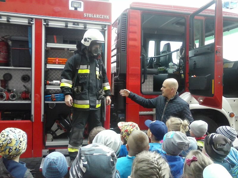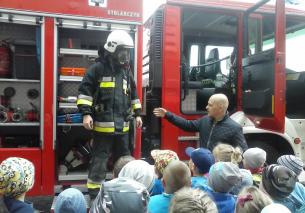 Przedszkolaki dowiedziały się, że praca strażaków polega nie tylko na gaszeniu pożarów, ale również na udzielaniu pomocy ludziom podczas powodzi, wypadków samochodowych, anomalii pogodowych i innych niebezpiecznych wydarzeń. Największe zainteresowanie wzbudził wóz strażacki. Strażacy zademonstrowali wykorzystywaną w akcjach aparaturę oraz wyposażenie wozu strażackiego, między innymi: gaśnice, węże, nowoczesne nożyce służące do przecinania pojazdów, karoserii podczas wypadków. Dzieci przekonały się również jak głośno może być w remizie i obok niej kiedy zadziała syrena. Ogromną atrakcją okazał się pokaz użycia węża z wodą. Delikatny wiatr zrosił kroplami każdego z obserwujących to widowisko.