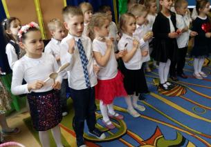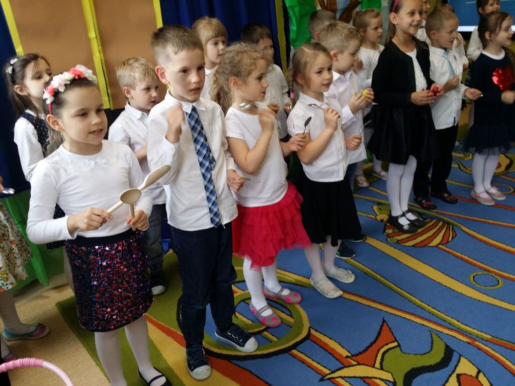 Jedna z najmłodszych grup zaprezentowała rodzicom pięknie wyrecytowane wierszyki okolicznościowe, śpiewanie piosenek oraz grę na instrumentach perkusyjnych. Po wręczeniu prezentów goście razem z dziećmi mieli okazję do wspólnej zabawy poprzez malowanie portretów na streczu.