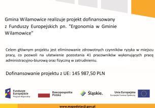 Gmina Wilamowice realizuje projekt pn. „Ergonomia w Gminie Wilamowice”. Projekt jest realizowany w ramach Regionalnego Programu Operacyjnego Województwa Śląskiego na lata 2014-2020 (Europejski Fundusz Społeczny).