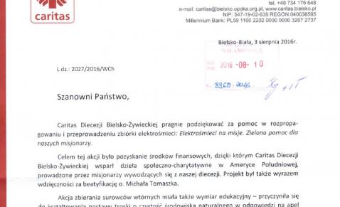 Podziekowanie od Caritas Diecezji Bielsko-Żywieckiej